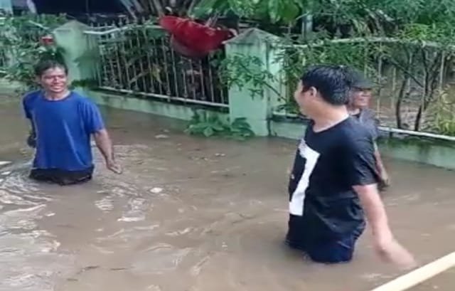 Banjir juga terpantau di Jalan Kepayang, Kemiling Permai, Bandar Lampung di depan sebuah minimarket. Sindi mengatakan, ketinggian air mencapai 15 – 25 Cm.