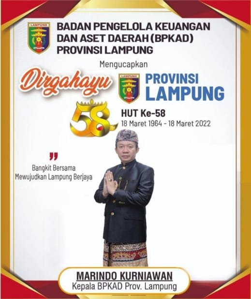 BPKAD Provinsi LampungTiga Serangkai18 Maret 2022Bandarlampung, Mesuji, PemerintahanBadan Pengelolaan Keuangan dan Aset Daerah (BPKAD) Provinsi Lampung, DIRGAHAYU ke-58 Provinsi Lampung (18 Maret 1964-18 Maret 2022). “Bangkit Bersama Mewujudkan Lampung Berjaya”Baca jugaMeningkat, PAD 2025 Lampung Utara Capai 1,6 TriliunDPA 2026 Fokus Anggaran Prioritas, Realisasi DigasPuluhan Proyek Gagal Akibat Dokumen OPD Serampangan, SDM Rendah“Jurus Mabuk” Walikota Eva Dwiana, Empat Kepala OPD Di-Plh-kan, Belasan Kepala SD dan SMP Rangkap Jabatan PltKuasa Hukum Nurdjadi, Gindha Ansori Wayka Laporkan Penyerobotan Tanah ke Polda LampungGRANAT Lampung Kembali Gelar Workshop dan Orientasi P4GNPTPN I Regional 7 dan Kodam XXI Raden Intan Kerja Sama Sinergi Ekonomi dan KeamananJihan Beri Penghargaan Donatur, Bumbung Kemanusiaan Kwarda Lampung Himpun Dana Rp432.917.626Puluhan Proyek Gagal Lelang, DPRD Lampura Soroti Kinerja Dinas SDABMBKAzry Ayu Nabillah Pimpin Federasi Triathlon Lampung