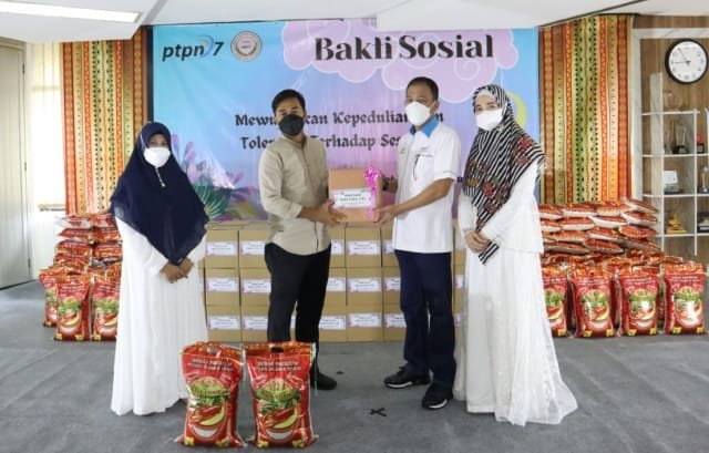 Pembagian sembako diserahkan secara simbolis Direktur PTPN VII Ryanto Wisnuardhy, SEVP I Budi Susilo, SEVP II Dicky Tjahyono, SEVP Bussines Okta Kurniawan, dan Wakil Ketua Ny. Rosalinda Dicky Tjahyono, Ny. Pami Okta Kurniawan dan Ny. Indah Budi Susilo.