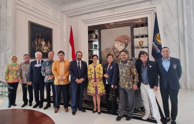 Airlangga mengunjungi NasDem didampingi Sekjen Golkar Lodewijk F Paulus, Nurul Arifin, Airin Rachmi Diany, Rizal Malarangeng hingga Agus Gumiwang Kartasasmita. Kedatangan Ketum Golkar disambut Paloh didampingi Hermawi Taslim, Enggartiasto Lukita hingga Lestari Moerdijat. (W9-jm)