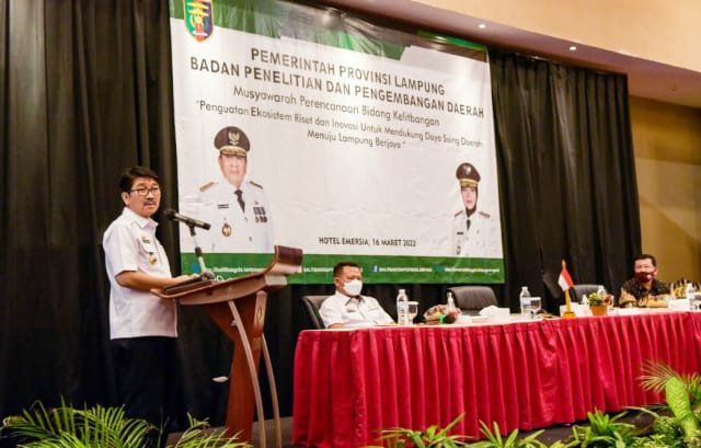 Kegiatan yang bertemakan “Penguatan Ekosistem Riset dan Inovasi untuk Mendukung Daya Saing Daerah Menuju Lampung Berjaya”, dibuka oleh Gubernur Lampung Arinal Djunaidi, diwakili oleh Kepala Badan Penelitian dan Pengembangan Daerah (Balitbangda) Provinsi Lampung Ir. Hamartoni Ahadis, MSi.
