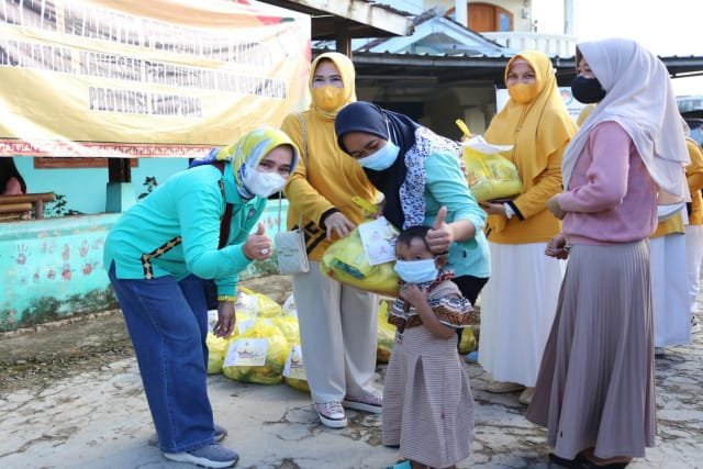 Ketua TP PKK Provinsi Lampung Ibu Riana Sari menyerahkan bingkisan kepada masyarakat. (foto : ist)