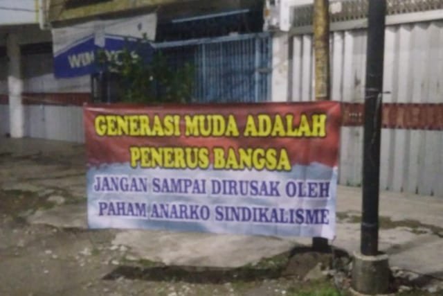 Terlihat banyak baner bertebaran di jalan jalan di Kota Bandarlampung, terlihat di jalan Wolter Monginsidi, Telukbetung Utara. Dalam baner tertulis “Generasi Muda Adalah Penerus Bangsa Jangan Mau Dirusak Oleh Paham Anarko Sindikalisme”.