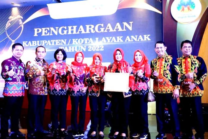 Jawa Barat, Warta9.com – Bupati Tulang Bawang Dr. Hj. Winarti menerima penghargaan Kabupaten Layak Anak (KLA) Tahun 2022. Penghargaan dari Menteri Pemberdayaan Perempuan dan Perlindungan Anak Indonesia tersebut, diserahkan di Novotel Hotel Golf, Bogor, Jawa Barat, Jumat (22/07/2022)