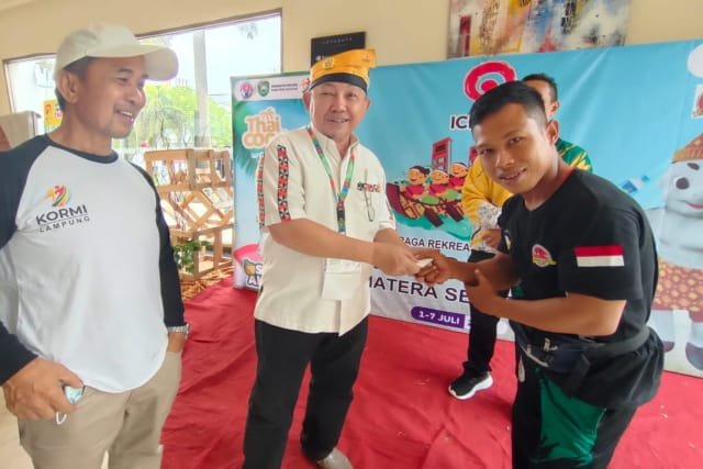 Ketua KORMI Lampung Ansori Djausal menyerahkan tali asih kepada atlet Fornas peraih emas. (foto : ist)