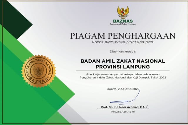 Piagam penghargaan Nomor : B/023-71/BKPU/KD.02.14/VIII/2022, tertanggal 2 Agustus 2022 yang ditandatangani oleh Ketua BAZNAS RI Prof. Dr. KH. Noor Achmad, MA, diberikan kepada Baznas Lampung atas Kerjasama dan Partisipasinya dalam Pelaksanaan Pengukuran Indeks Zakat Nasional dan Kaji Dampak Zakat 2022.