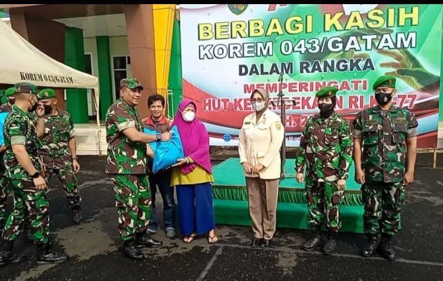 Danrem 043/Gatam Brigjen TNI Ruslan mengatakan, penyerahan bingkisan sembako ini dilaksanakan dalam rangka memperingati HUT Ke-77 Kemerdekaan RI sekaligus bentuk kepedulian Korem kepada masyarakat dalam upaya menjalin dan mempererat hubungan yang harmonis antara masyarakat dan TNI AD.