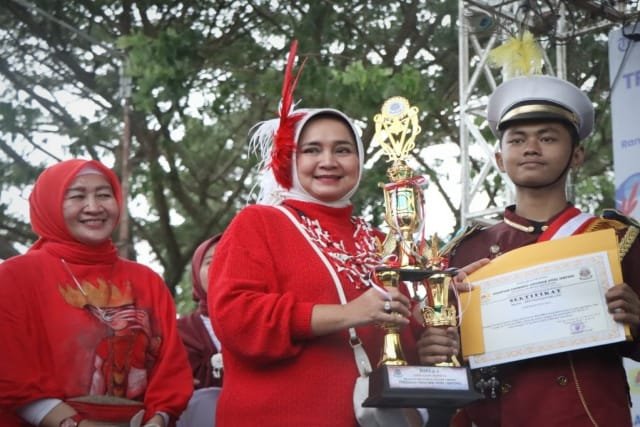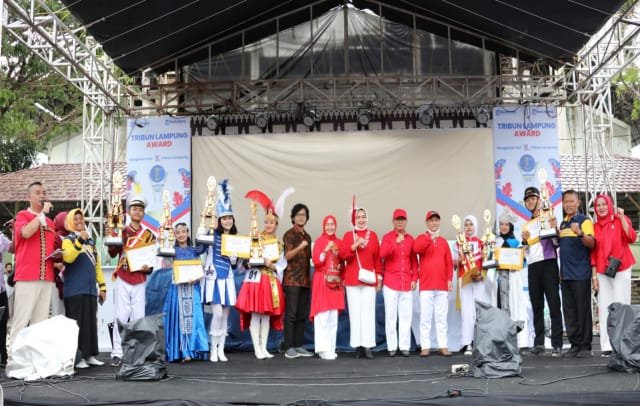 Ketua Umum Persatuan Drumband Indonesia (PDBI) Provinsi Lampung Riana Sari Arinal didampingi Ketua DWP Lampung Mamiyani Fahrizal dan Pemimpin Redaksi Tribun Lampung Ridwan Hardiansyah menyerahkan trofi serta piagam penghargaan kepada perwakilan pemenang Kirab Drum Band/Marching Band Tahun 2022, di Lapangan Saburai Enggal.
