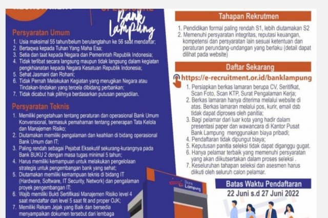 Bandarlampung, Warta9.com – PT Bank Pembangunan Daerah Lampung mengundang para Bankir Profesional untuk mengikuti seleksi calon Dirtektur Operasional PT Bank Pembangunan Daerah Lampung dengan Persyaratan sebagai berikut :