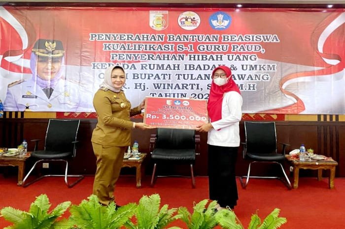 “Untuk bantuan beasiswa kualifikasi S-1 Guru PAUD tahun 2022 terdapat 35 orang penerima. Terhitung sejak 2018 hingga 2022, jumlah penerima bantuan beasiswa kualifikasi S-1 Guru PAUD sebanyak 225 orang dengan total nominal Rp3,5 juta per orang. Selain itu, bantuan rumah ibadah serta UMKM batik tulis Shiha Ali Penawar Tama,” sebut Bunda Winarti, panggilan akrab Bupati.