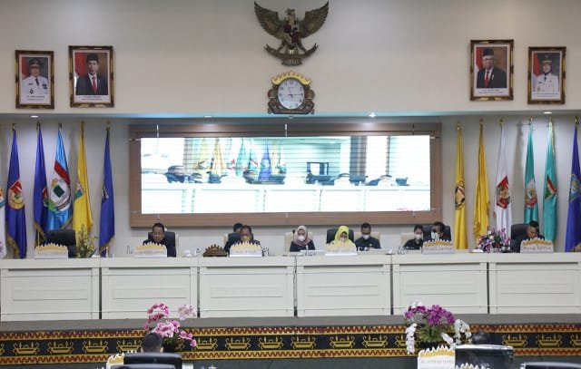 Rapat Paripurna menyampaikan jawaban atas Pemandangan Umum Fraksi-fraksi DPRD Provinsi Lampung yang dipimpin Ketua DPRD Lampung Mingrum Gumay, didampingi para Wakil Ketua Hj. Ely Wahyuni, Hj. Ririn Kuswantari, Raden Muhammad Ismail dan Fauzan Sibron, juga dihadiri para anggota Forkopimda, anggota Dewan dan Kepala OPD di lingkungan Pemprov Lampung. (W9-jam)