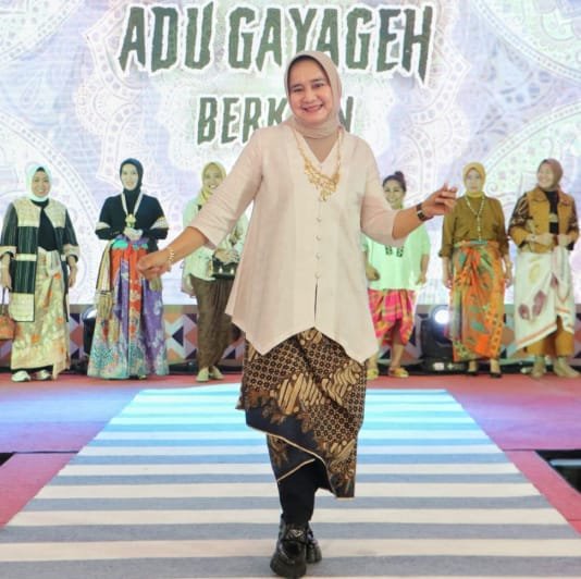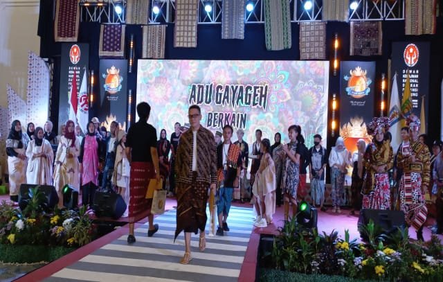 Semua kalangan mulai dari ibu-ibu, remaja, anak-anak ikut tampil dalam fashion show berkain, Jumat sore (21/10/2022). Bahkan Adu Gayageh Berkain juga diikuti para penjaga stand.