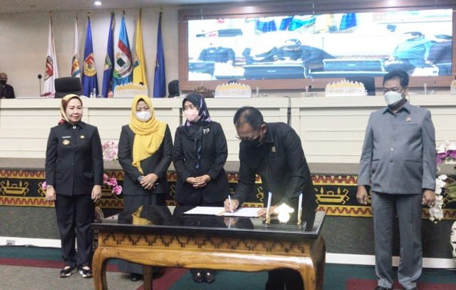 Ketua DPRD Mingrum Gumay menandatangani persetujuan bersama Raperda APBD 2023. (foto : ist)