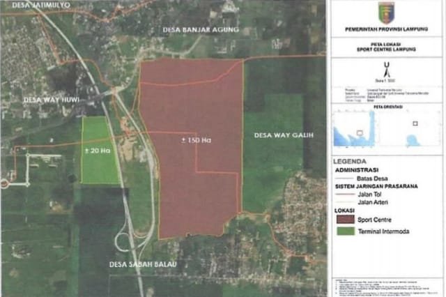 Sekdaprov melalui suratnya tertanggal 20 Desember 2022, menyebutkan, berdasarkan SK Gubernur Lampung Nomor : G/730/B.06/HK/2022 tanggal 30 November 2022 tentang Penetapan Lokasi Pembangunan Sport Center beserta fasilitasnya di Provinsi Lampung tanah yang akan dipergunakan sebagai Sport Center beserta fasilitasnya, berada di wilayah administrasi Lampung Selatan meliputi Kecamatan Jati Agung Desa Banjar Agung dan Desa Way Hui, Kecamatan Tanjungbintang Desa Way Galih dan Desa Sabah Balau dengan total luas lahan kurang lebih 1.700.000 M2 (170 ha).