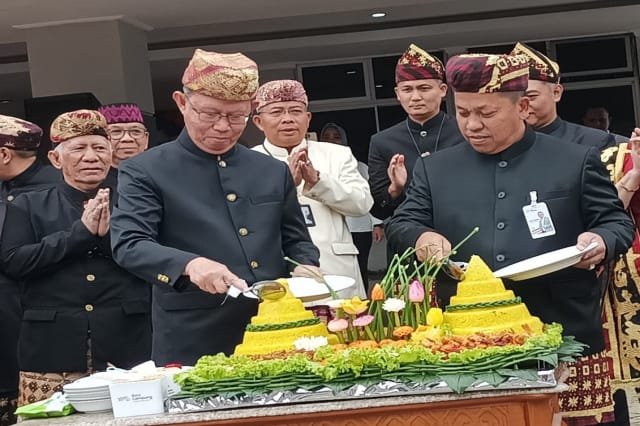 Dalam acara HUT ke-57, selain menggelar upacara juga dilakukan pemotongan tumpeng oleh Komisaris Utama Bank Lampung Fahrizal Darminto dan Dirut Presley Hutabarat. (W9-jam)