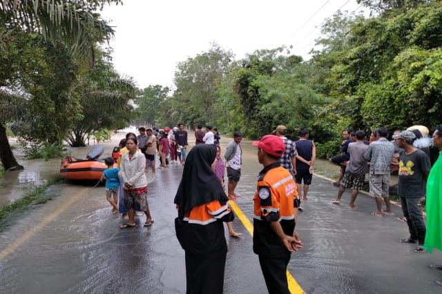 Akibat dampak banjir di Kampung Astra Ksetra, Kecamatan Menggala, arus lalu lintas dialihkan. Rekayasa lalu lintas dilakukan di Tugu Garuda Terminal Menggala, Kabupaten Tulangbawang.