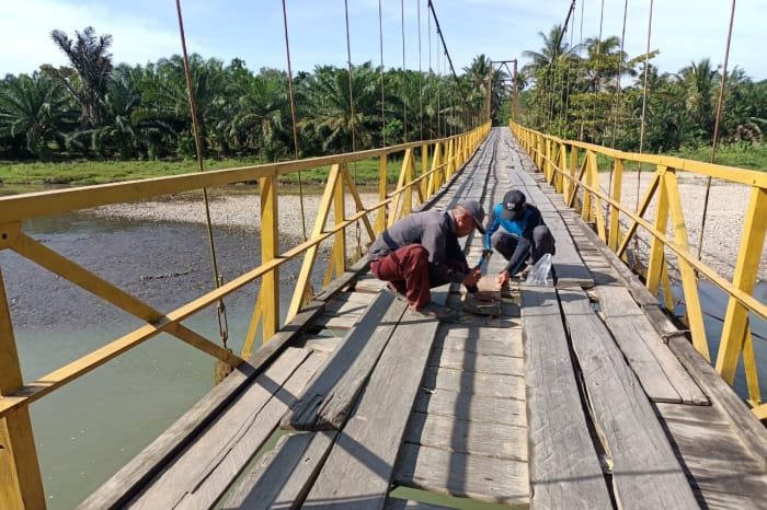 Prosesi pengerjaan jembatan dipandu oleh Kepala Desa Nukhtar bersama perangkat desa setempat. Melihat kondisi lantai jembatan yang berserakan dikhawatirkan pengguna jalan terperosok. Telebih yang melintasi jembatan bakal meningkat selama suasana lebaran.