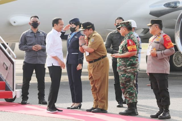 Kedatangan Presiden Jokowi disambut Gubernur Lampung Arinal Djunaidi dan jajaran Forkopimda Provinsi Lampung di Bandara Raden Inten II Natar Lampung Selatan, Jumat pagi.