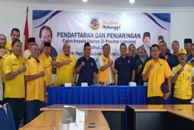 Ketua Tim Penjaringan DPW Nasdem Lampung Rahmat Husein mengatakan Calon Gubernur Lampung Ir.H.Hanan A.Rozak datang mengembalikan berkas sesuai tahapan yang ditentukan oleh DPW Nasdem Lampung.
