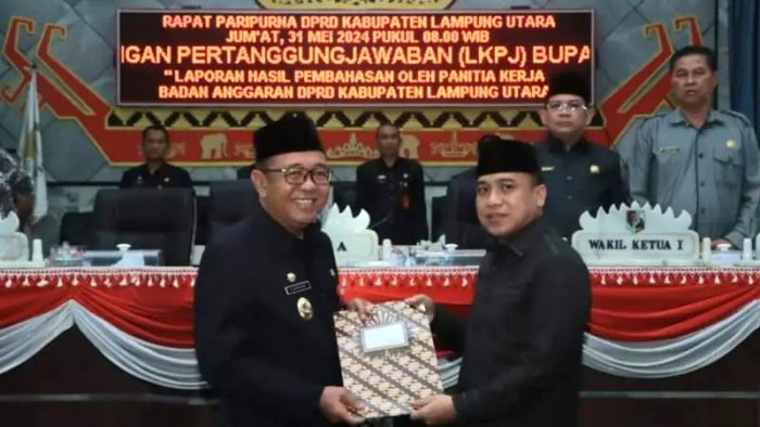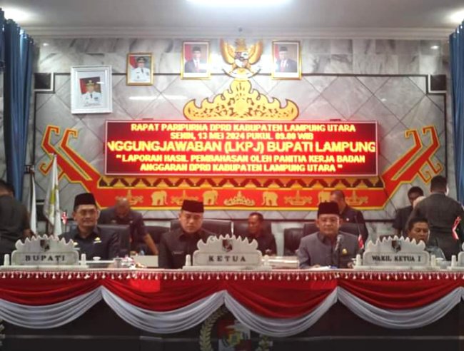 Kotabumi, Warta9.com – Sidang Paripurna DPRD dengan agenda Pengesahan Laporan Keterangan Pertanggungjawaban atau LKPj Bupati Lampung Utara tahun Anggaran 2023 akhirnya dapat terlaksana pada, (01/06/2024).