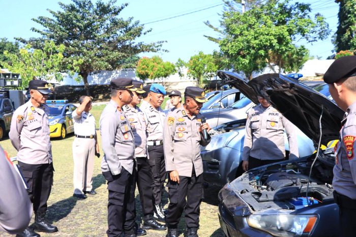 Kendaraan dinas yang diperiksa terdiri dari kendaraan truk 3 unit, bus 2 unit, sedan 19 unit, minibus 15 unit, mobil double cabin 16 unit, motor patroli 152 unit dan motor Bhabinkamtibmas 117 unit.