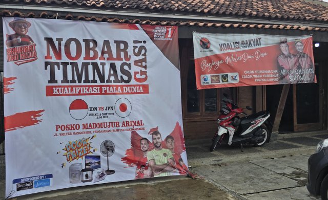 Nonton bareng Tim Nasional Indonesia melawan tim nasional Jepang itu digelar di Posko Mad Mujur Jalan Wolter Mongonsidi nomor 10 Keluarahan Pengajaran Bandarlampung.