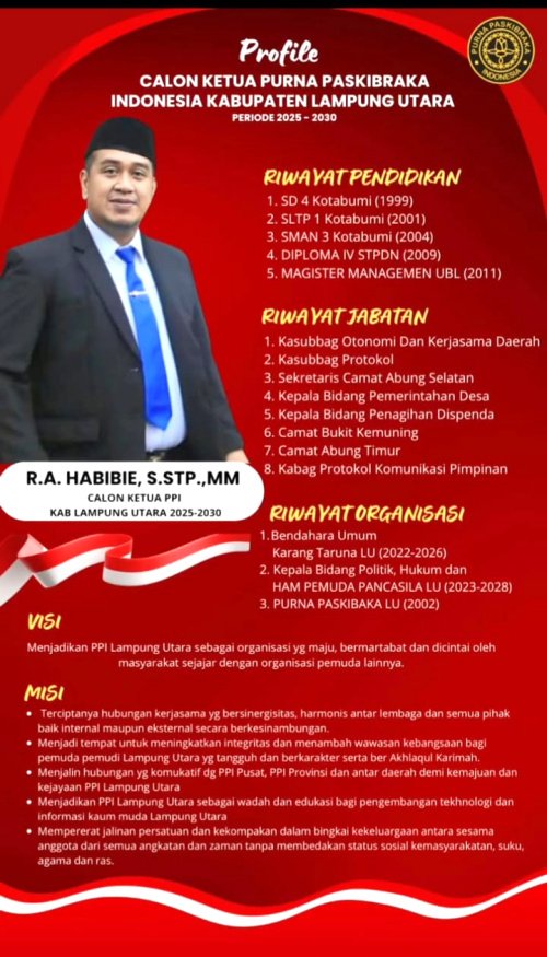 Kotabumi – Dunia kepemudaan di Kabupaten Lampung Utara bersiap menyambut energi baru dengan hadirnya sosok inspiratif, R.A. Habibie, S.STP., MM, sebagai calon Ketua Purna Paskibraka Indonesia (PPI) Kabupaten Lampung Utara periode 2025–2030. Latar belakang birokrasi yang kuat, pengalaman organisasi yang luas, serta visi besar untuk kemajuan PPI menjadikan pria ini kandidat yang patut diperhitungkan.