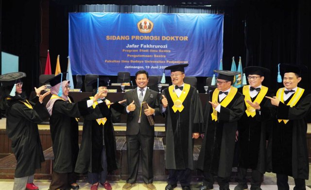 Pada akhir sidang, Jafar menyampaikan terima kasihnya kepada tim promotor, penguji, dekanat FIB, serta semua yang berperan dalam keberhasilan studi S3 di Universitas Padjadjaran. “Utamanya saya sangat berterima kasih kepada Yayasan Pendidikan Teknokrat dan pimpinan universitas yang telah memberikan dukungan baik berupa beasiswa, fasilitas, maupun dukungan moriil, sehingga saya dapat menyelesaikan studi ini dengan baik,” tutur Jafar.