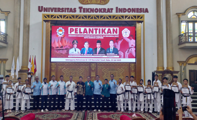 Walikota Eva Dwiana yang disambut langsung oleh Rektor Universitas Teknokrat Indonesia Dr. HM. Nasrullah Yusuf, SE, MBA, menghadiri pengukuhan pengurus Pengcab KKI Bandarlampung di Gelanggang Mahasiswa Dr. H.M Nasrullah Yusuf, Rabu (23/7/2025).