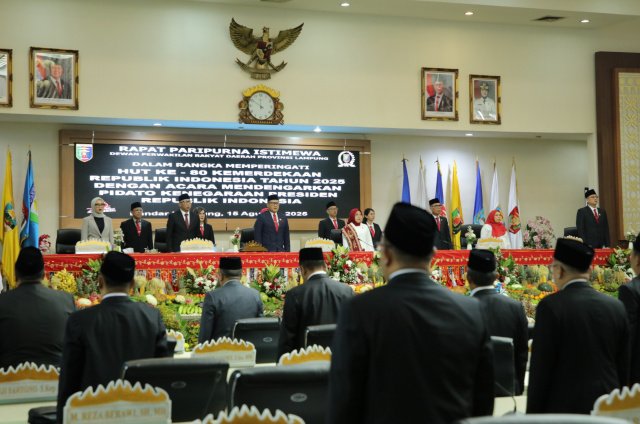 Bandarlampung, Warta9.com — Gubernur Lampung Rahmat Mirzani Djausal, Wakil Gubernur Jihan Nurlela, unsur Forkopimda Provinsi Lampung, pimpinan dan anggota DPRD Provinsi Lampung, mengikuti Rapat Paripurna Istimewa DPRD Provinsi Lampung. Rapat Paripurna istimewa DPRD mendengarkan Pidato Kenegaraan Presiden Prabowo Subianto dalam rangka Hari Ulang Tahun (HUT) RI ke- 80, secara virtual, di Ruang Sidang DPRD Provinsi Lampung, Jumat (15/8/2025).