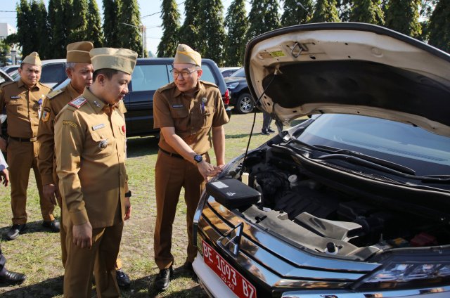 Sekdaprov Marindo didampingi jajaran eselon II melakukan peninjauan langsung terhadap kendaraan dinas di lingkungan Pemprov Lampung.