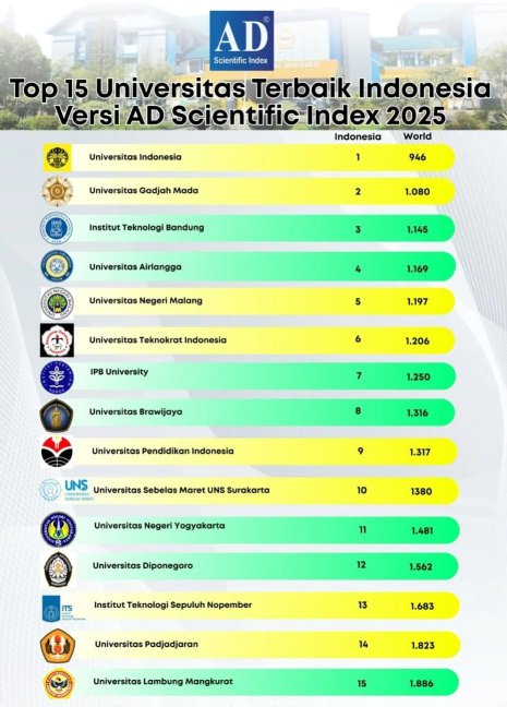 AD Scientific Index sendiri merupakan sistem pemeringkatan internasional yang menilai kualitas institusi berdasarkan distribusi ilmuwan.