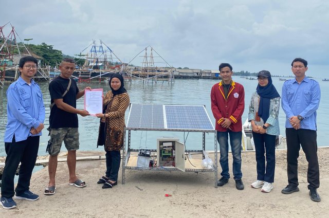 Nelayan Bagan Desa Rangai Tri Tunggal Katibung Lampung Selatan menerima bantuan panel listrik tenaga Surya dari Mahasiswa Universitas Teknokrat Indonesia yang diserahkan oleh Kaprodi Elka Pranita kepada Mang Mamat nelayan setempat. (foto : ist)