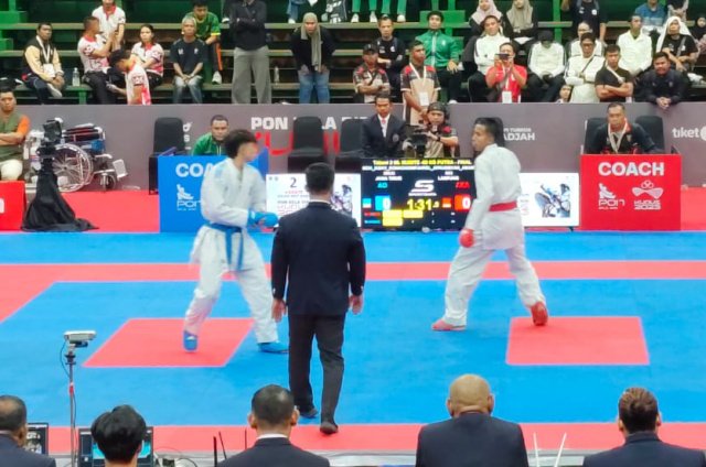 Fahrel Apriansyah Amartha meraih medali emas, setelah berhasil mengalahkan karateka asal Jawa Timur bernama Mohammad Risky Romadhoni dengan skor 4-4.