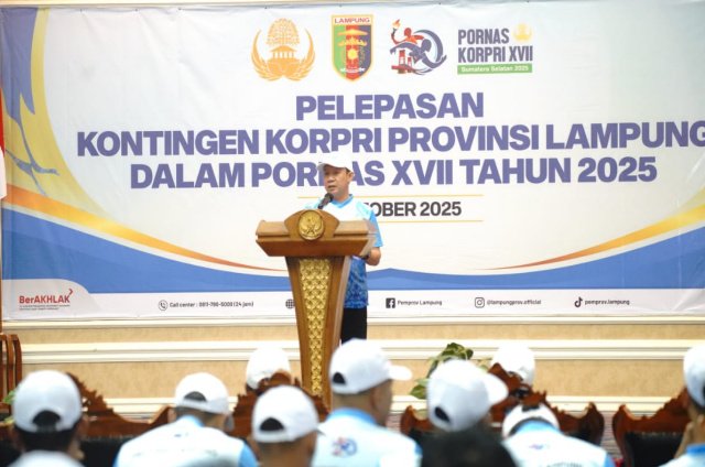Bandarlampung, Warta9.com — Gubernur Lampung Rahmat Mirzani Djausal diwakili Sekretaris Daerah Provinsi Lampung Marindo Kurniawan, melepas Kontingen Korpri Provinsi Lampung yang akan mengikuti Pekan Olahraga Nasional (Pornas) XVII Korpri Tahun 2025 di Palembang Sumatera Selatan, Kamis (2/10/2025), bertempat di Balai Keratun Lt. III.