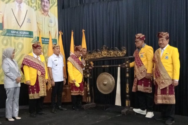 Hanan A Rozak didampingi Sekretaris Golkar Lampung H. Aprozi Alama, SE, Ketua Harian H. Riza Mirhadi, SH, Plt Ketua Golkar Lamsel H. Tony Eka Candra, Wakil Bupati Lampung Selatan, M. Syaiful Anwar, S.T, M.Pd, Ketua DPRD Kabupaten Lampung Selatan, Erma Yusneli, S.E, MM, membuka Musda XI Golkar Lamsel ditandai pemukulan gong.