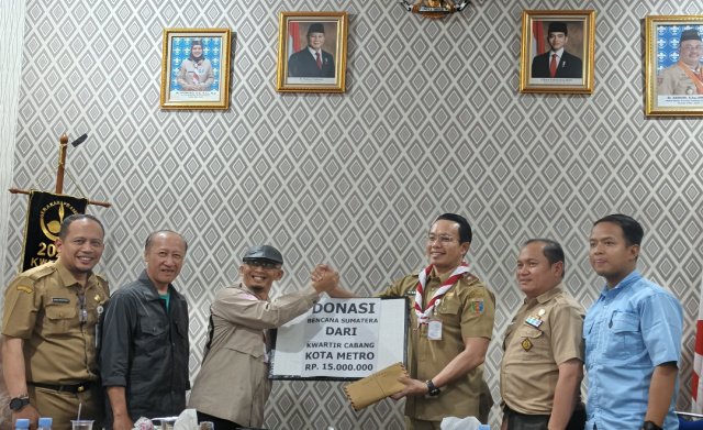 Ketua Harian Kwarda Lampung Riski Sofyan, hadir mewakili Ketua Kwarda Lampung Jihan Nurlela, menerima secara simbolis donasi sebesar Rp15.000.000 dari Kwarcab Kota Metro.